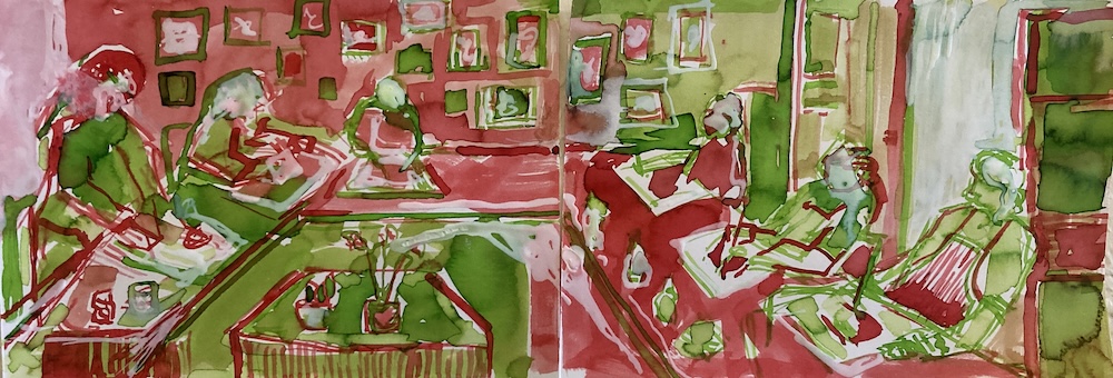I teach on these different courses – November – Printmaking, March & August – Painting and Drawing with Ink, July – Painting & Drawing in Nature.   click on the links for dates/prices/availability…… above image is an ink sketch of some of my students busy creating.